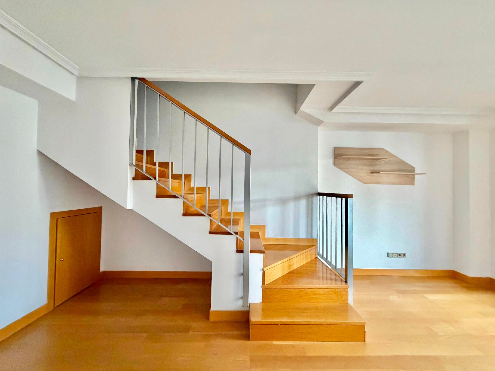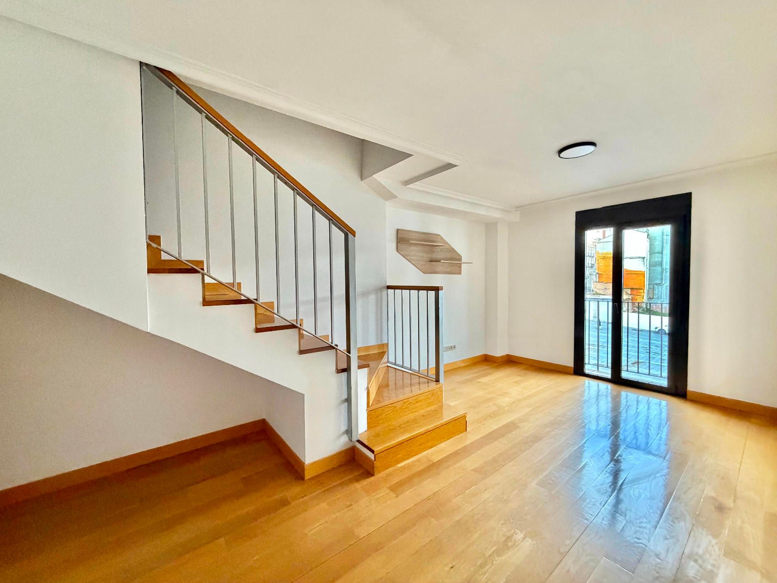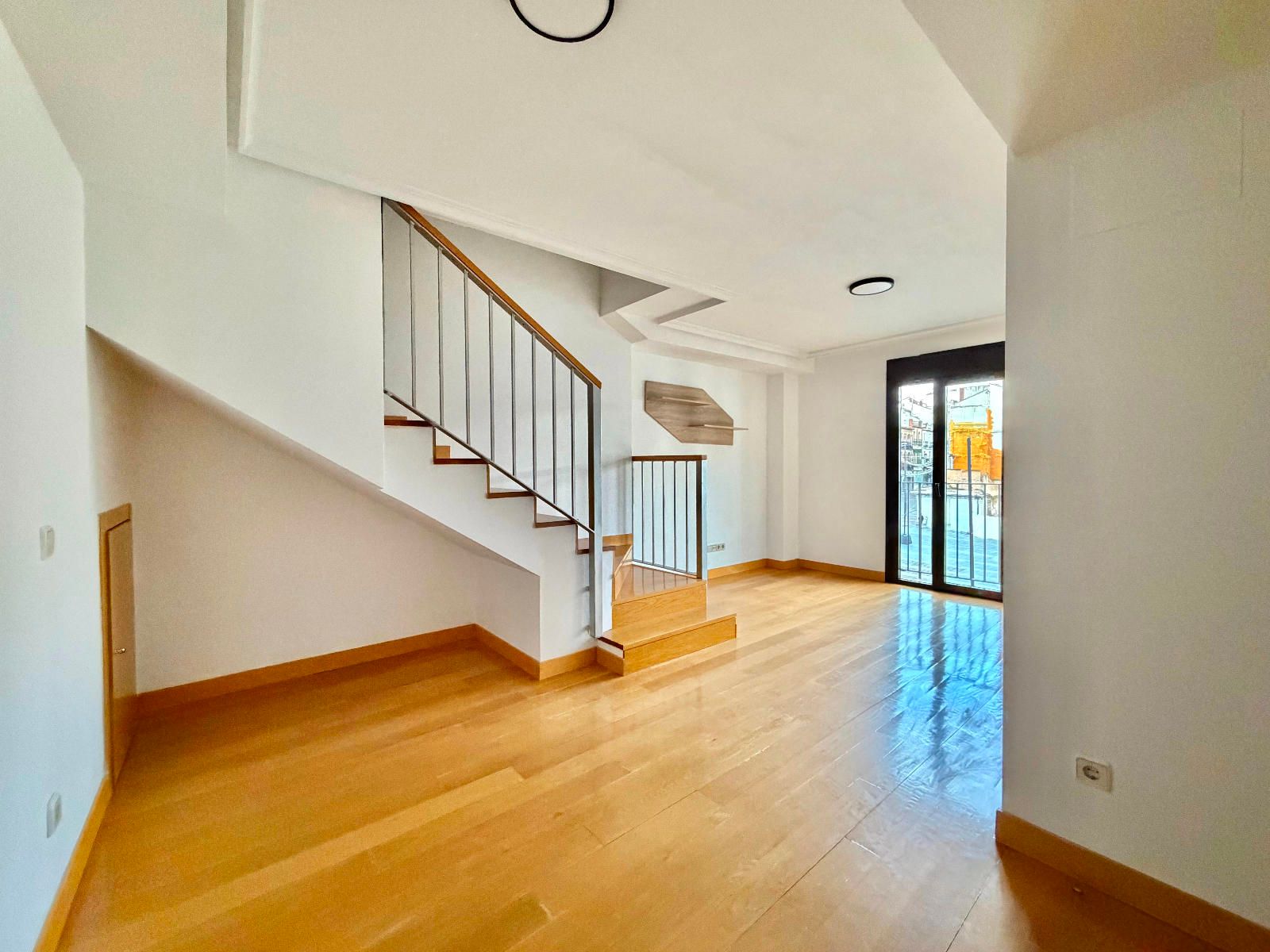 PLANTA BAJA - Distribuidor desde el que se accede a todas las estancias, un salón con escalera vista a la planta de arriba y un trastero bajo la escalera, amplia cocina completamente amueblada con todos los electrodomésticos y espacio para poner una mesa y el dormitorio principal, con varios armarios y un baño completo en suite con plato de ducha, todas las estancias de esta planta son muy luminosas y cuentan con un balcón con vistas despejadas a la plaza Mayor.