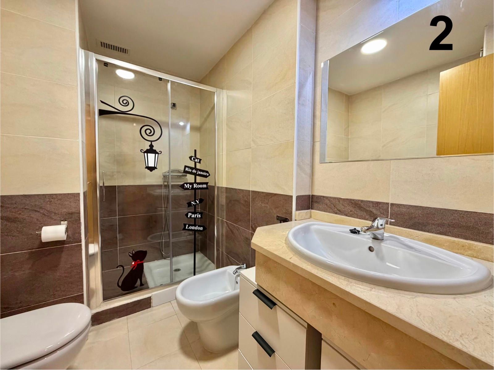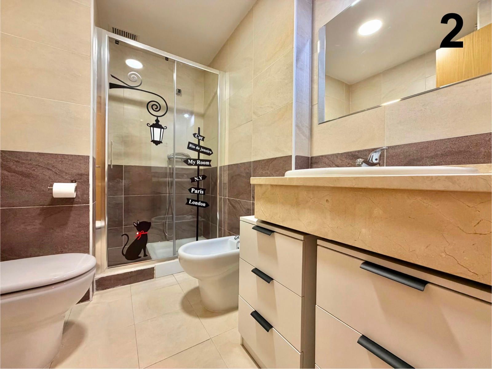 - Baño en suite con plato de ducha, bidé y lavabo con espejo y cajoneras